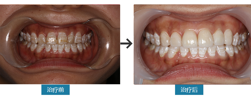 13-23中度氟斑牙,牙冠完整无缺损,建议瓷贴面修复。设计修复方案,患者同意,局麻,13-23常规贴面预备,抛光,取模,制备暂时冠,抛光。一周后,去临时冠,粘接永久冠。